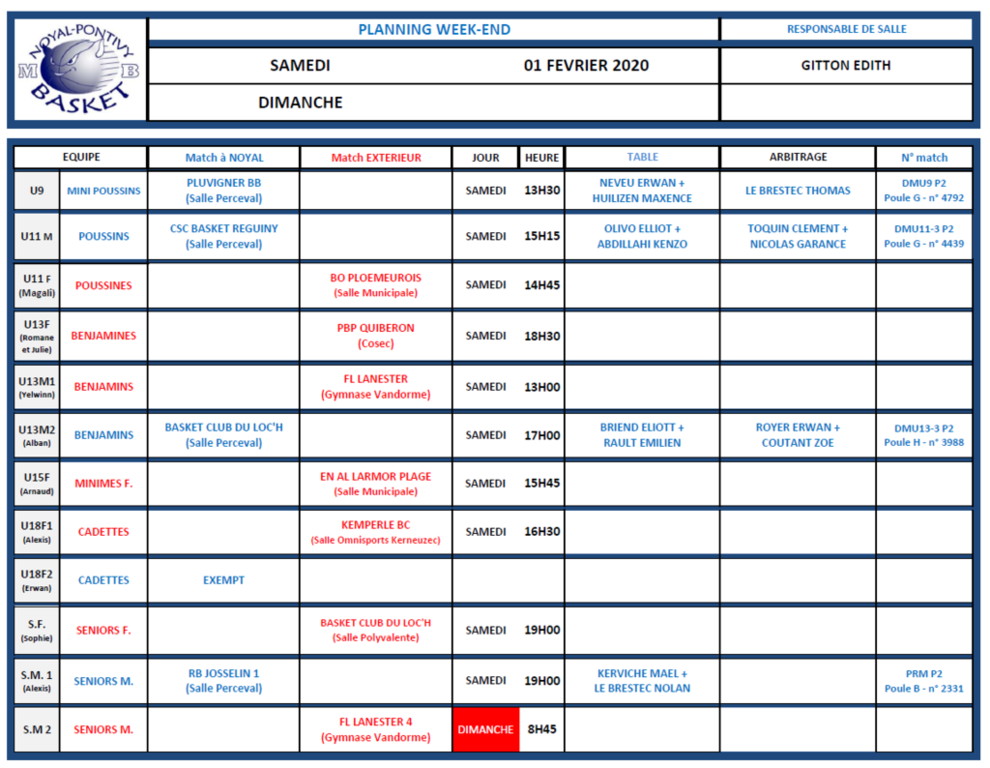 PLANNING SAMEDI 1er et DIMANCHE 2 FÉVRIER 2020
