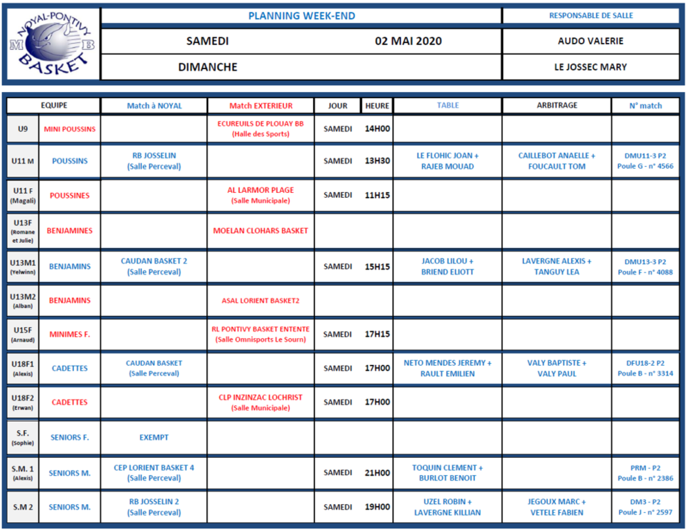 PLANNING SAMEDI 28 ET DIMANCHE 29 MARS 2020
