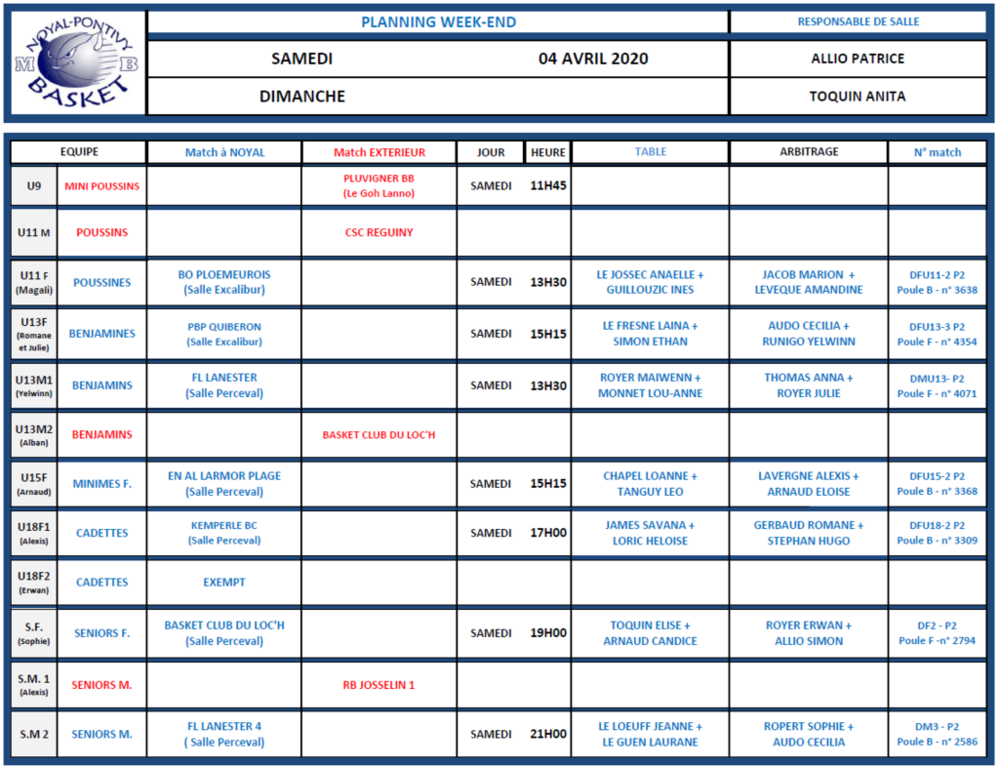 PLANNING SAMEDI 28 ET DIMANCHE 29 MARS 2020