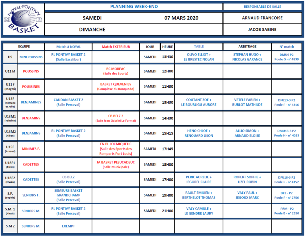 PLANNING SAMEDI 28 ET DIMANCHE 29 MARS 2020