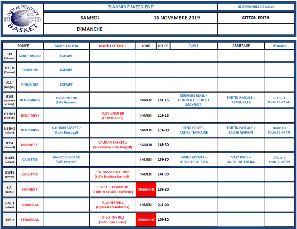 SAMEDI 16 ET DIMANCHE 17 NOVEMBRE 2019 - PLANNING DE SALLE