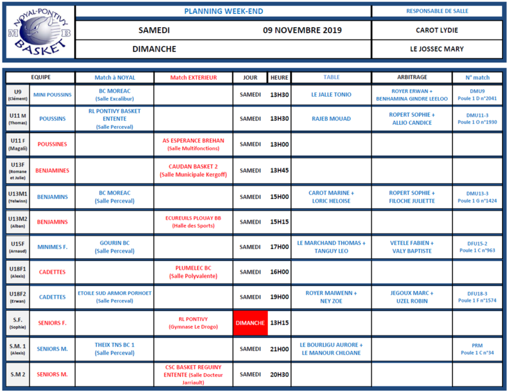 SAMEDI 9 et DIMANCHE 10 NOVEMBRE 2019 - PLANNING DE SALLE